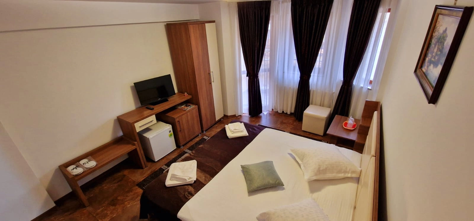 Descoperă o oază liniștită, unde ospitalitatea întâlnește rafinamentul într-un mod unic. Clădirea tradițională a pensiunii se îmbină perfect cu dotările moderne, garantându-ți un sejur plăcut și relaxant. Camerele decorate cu gust te așteaptă pregătite, mai ales că sunt echipate pentru a-ți îndeplini toate dorințele.